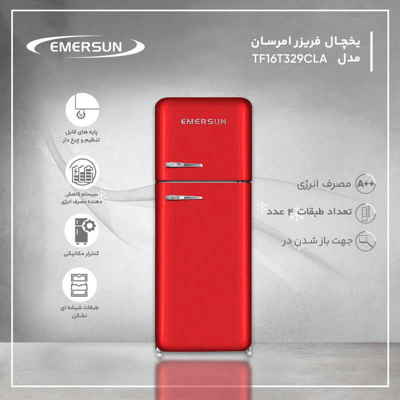 مدل «TF16T329CLA» یکی از جذابترین یخچالهای سری بالاپایین شرکت «امرسان» (Emersun) است. این یخچال در رنگهای متنوع و شادی تولید شده است که برای مثال میتوان به قرمز، صورتی، زرد و آبی اشاره کرد؛ بنابراین وجود این یخچال میتواند جلوهای تازه و مدرن را به هر آشپزخانهای بیاورد. صرف نظر از بحث طراحی و ظاهر دستگاه، مشخصات فنی TF16T329CLA شباهت زیادی به مدل TFH14T دارد. این یخچال هم، ردهبندی مصرف انرژی A++ را دارد؛ بنابراین مصرف برق خیلی کمی دارد و یکی از بهینهترین یخچالهای سری بالاپایین بازار محسوب میشود. یخچال فریزر TF16T329CLA، گنجایشی معادل ۲۹۳لیتر دارد که آن را به مدلی مناسب برای خانوادههای کمجمیعت و کوچک تبدیل میکند.