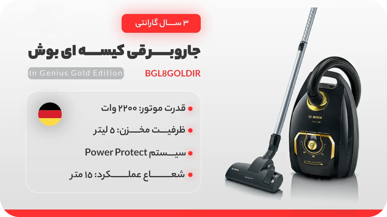 موتور جاروبرقی BGL8GOLDIR بوش بسیار قدرتمند و کم صدا میباشد و توان مصرفی آن 2200 وات است. تکنولوژیIn ‘genius Gold Edition که در این جاروبرقی تعبیه شده، یک تمیزی فوقالعاده را برای شما به ارمغان میآورد. سیستم Power Protect طراحی شده توسط شرکت سازنده با60 درصد قدرت مکش بیشتر باعث میشود تا با جریان هوای عالی، برای عملکرد تمیز کردن، شما جاروکشی پرقدرتی را داشته باشید، همچنین وجود این سیستم باعث افزایش مکش جاروبرقی در زمان نیمه پر بودن کیسه می گردد. سیستم Quattro Power عملکرد بسیار عالی در مکش دارد که باعث نتایج عالی در جارو کردن با مصرف انرژی کمتری میشود. این جاروبرقی دارای موتور کمپرسور HiSpin با تیغه های ایرودینامیک و کاملا کالیبره یکی از کم مصرف ترین جاروهای موجود در بازار است. فیلتر این جاروبرقی هپا (HEPA) میباشد که با ویژگی بالا برای عملکرد بهتر، تمام گرد و غبار را به خوبی به خود جذب می کند و مانع از پخش شدن در محیط میشوند و هوای خروجی 99 درصد بدون ذرات آلرژیزا هستند. همچنین این فیلتر قابل شستشو میباشد. پارویی این مدل جاروبرقی بوش مجهز به Air Bumper است که از ایجاد خطوط سیاه روشن روی مبلمان و از ایجاد خط و خش روی سطوح جلوگیری میکند. حجم کیسه گرد و غبار این مدل جاروبرقی 5 لیتر میباشد که این حجم باعث میشود شما ماه ها از یک کیسه استفاده کنید و در هزینه خرید مداوم کیسه صرفهجویی کنید. پاکت مصرفی این مدل جاروبرقی بوش تیپ G میباشد. وجود 5 عدد کیسه اضافی داخل جعبه دستگاه و برخورداری از شلنگ کنفی از دیگر مزایای این جاروبرقی بشمار میآید. لوازم جانبی همراه جاروبرقی شامل 3 ابزار حرفهای میباشد که شامل برس اثاثیه، برس بسیار بلند درزها و برس سری حرفهای که مجهز به سیستم Silence Sound است که باعث عملکرد بیصدا و آرام میباشد. لوله خرطومی این جاروبرقی بسیار باکیفیت است و به راحتی پاره نمی شود و تغییر شکل نمیدهد. این جاروبرقی بوش با دارا بودن لوله پلاستیکی تلسکوپی خود مناسب هر کاربری میباشد زیرا میتواند به راحتی لوله جاروبرقی را بلند و کوتاه کند. دسته این مدل جاروبرقی ارگونومیک میباشد که باعث سهولت در استفاده از آن میشود.
