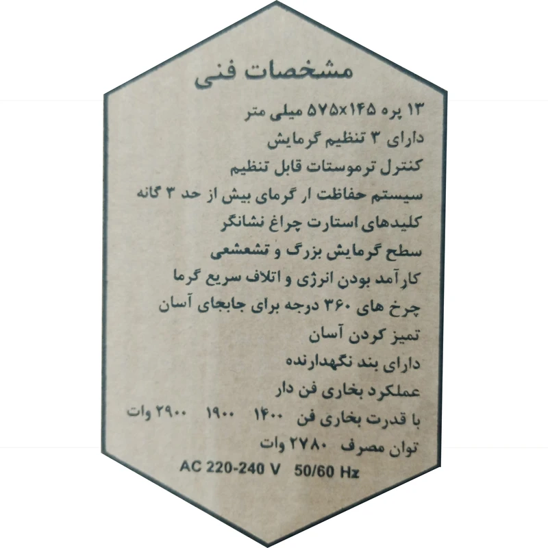 | حداکثر توان گرمایشی | ۲۹۰۰ وات |